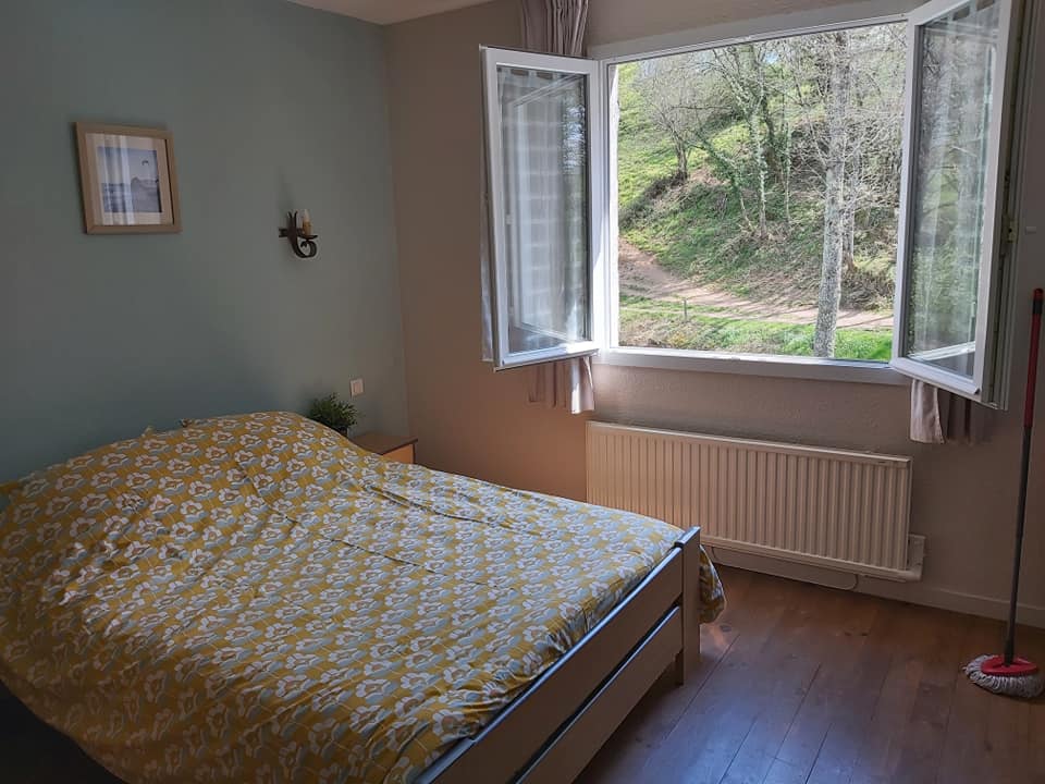 Dit is een kamer gelegen aan de achterkant, die uitkijkt over de tuin en de rivier. Hier staat een tweepersoonsbed …