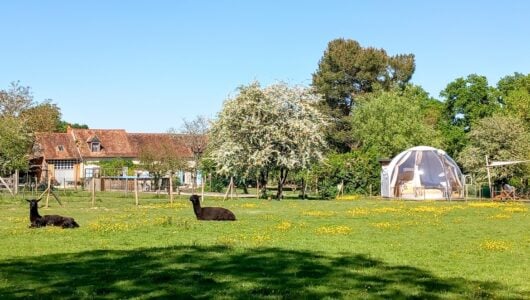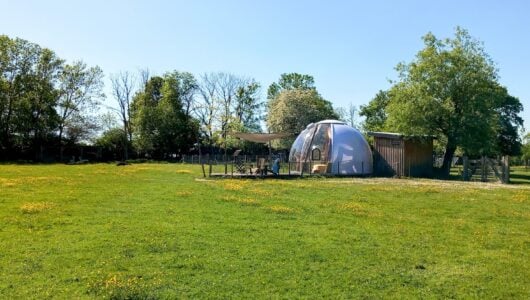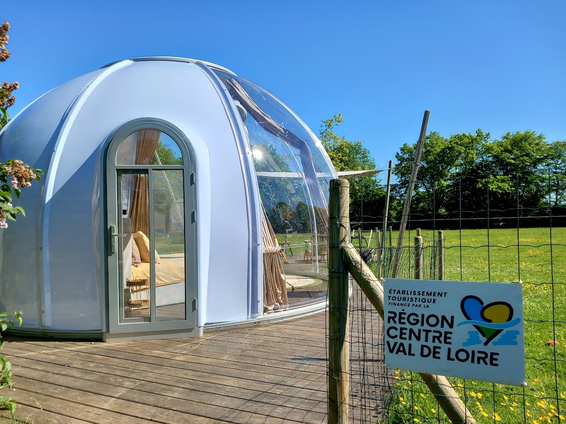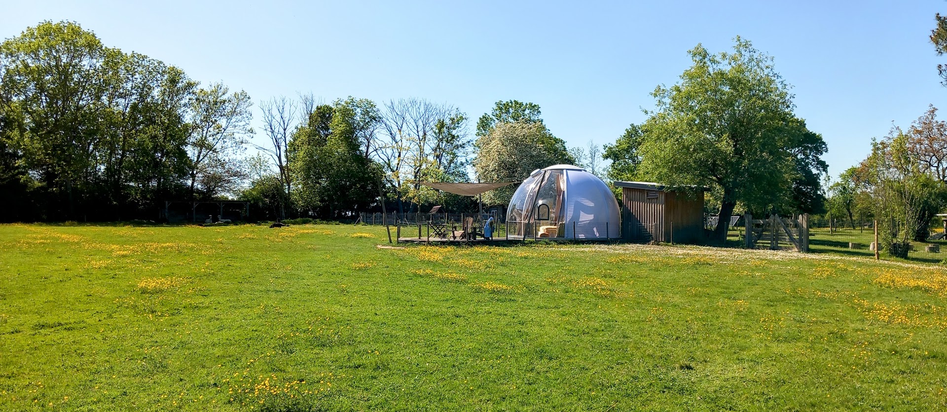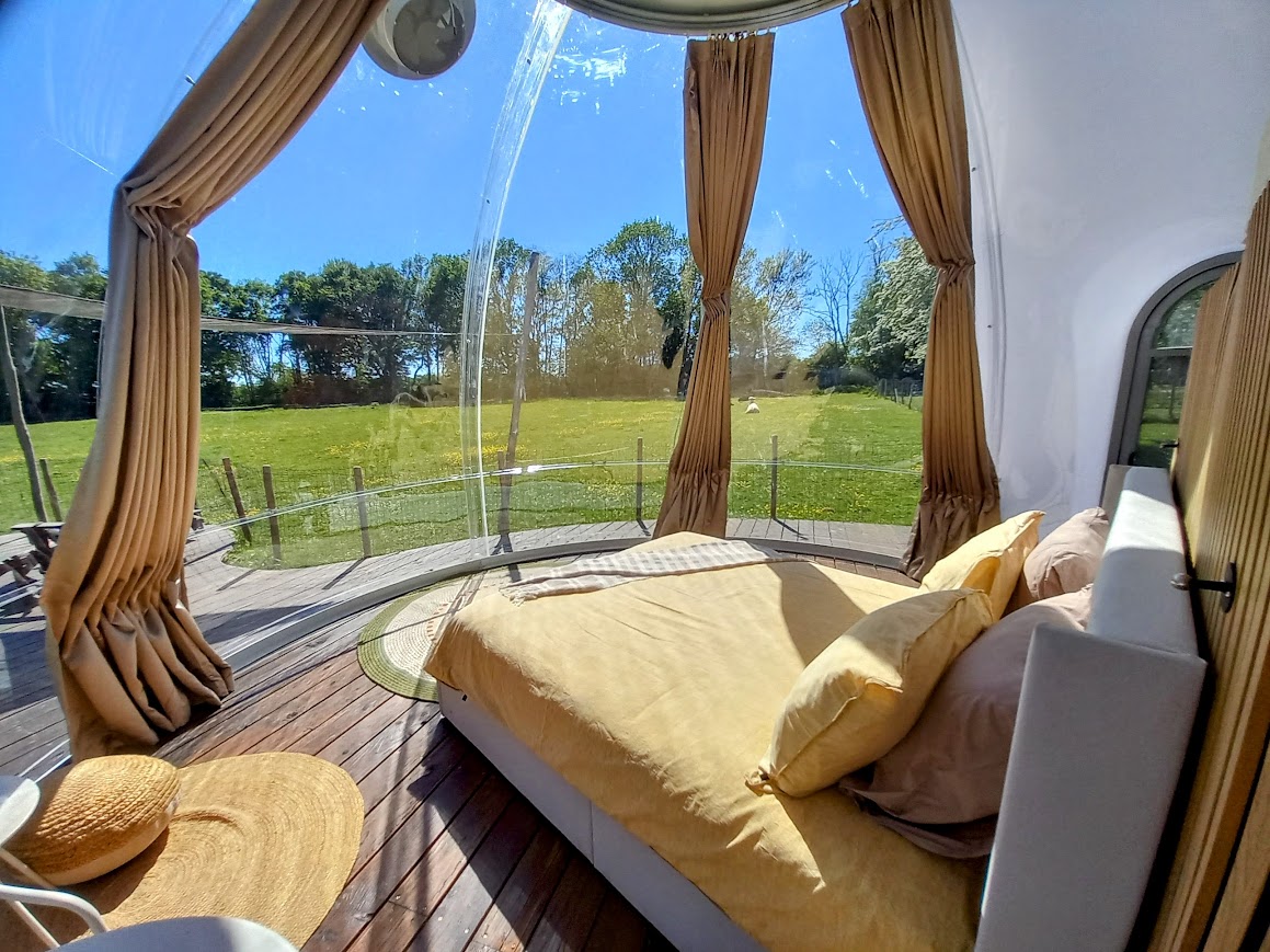 En wat dacht je van slapen in een heuse ‘dôme’? Deze transparante bulle staat in de alpacaweide. Je hebt een eigen terras rond de dôme met vrij uitzicht op de alpaca-weide, en er is een eigen sanitairhuisje met douche, wastafel en droogtoilet.