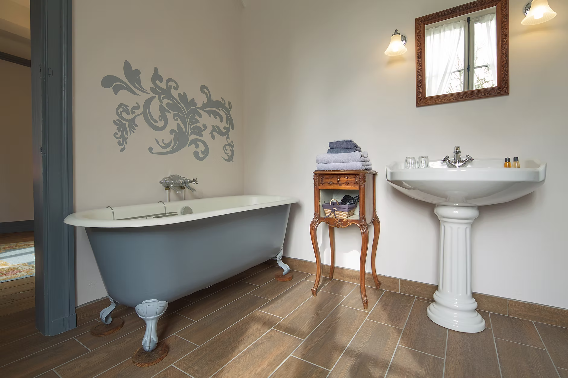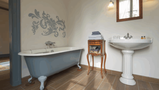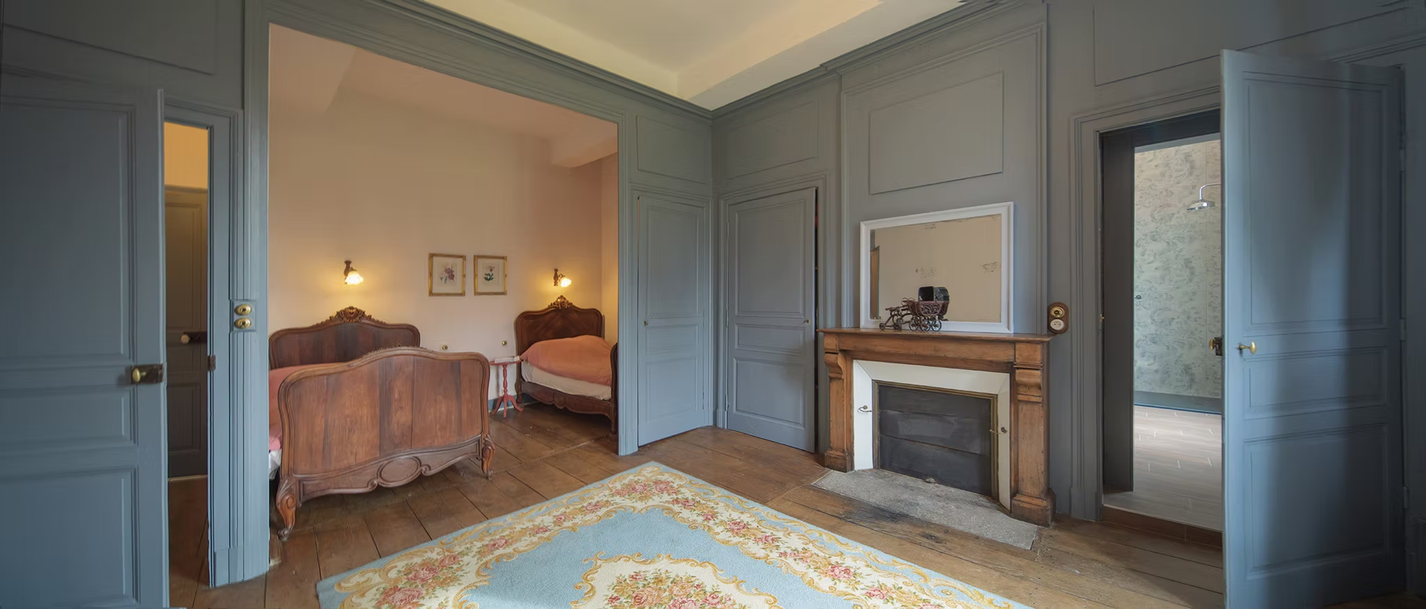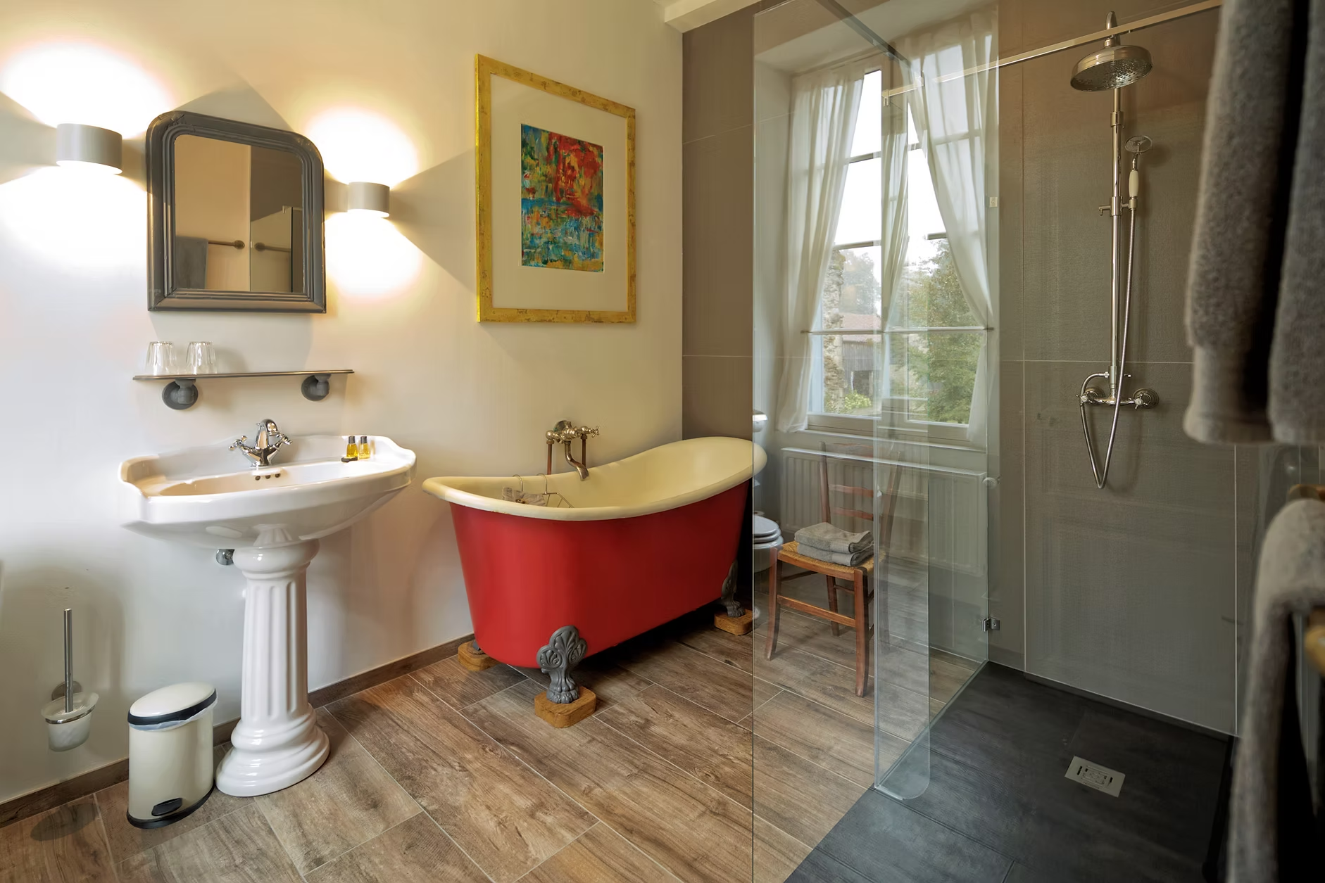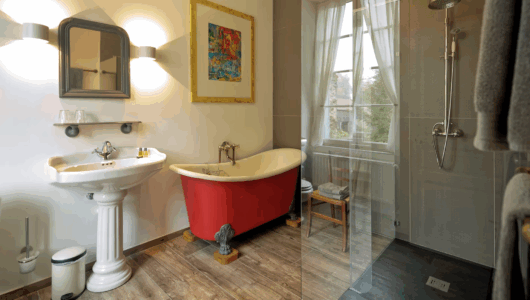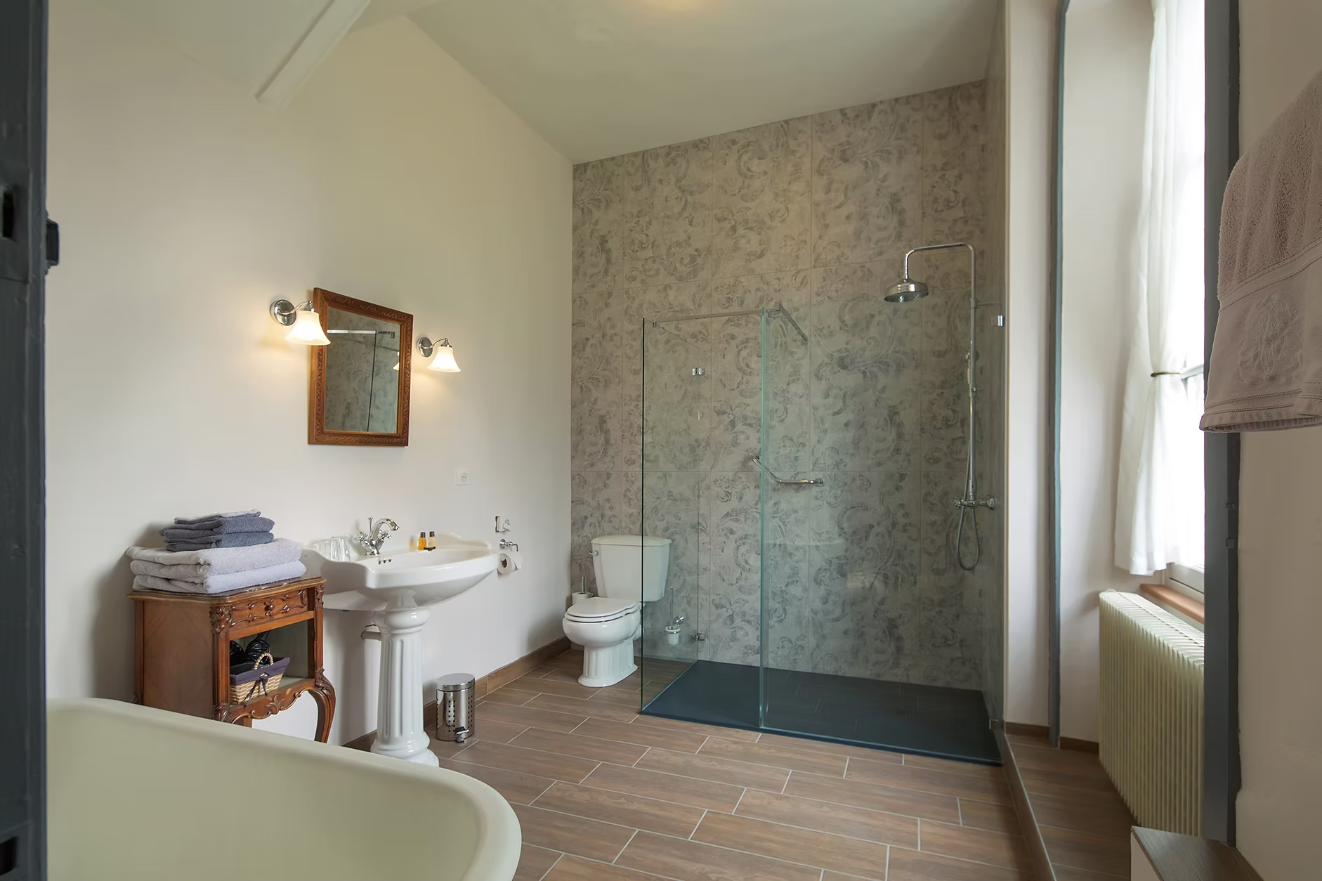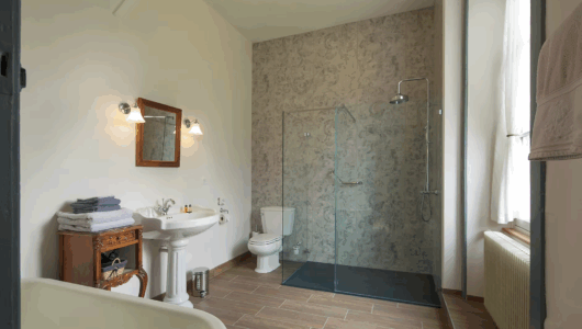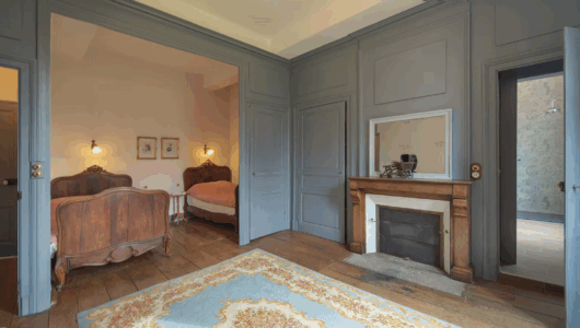 Vierpersoons kamer. Kijkt uit op de tuin en het park van de voormalige abdij. Klein koelkastje, waterkoker, Nespresso, picknickmandje. Badkamer …
