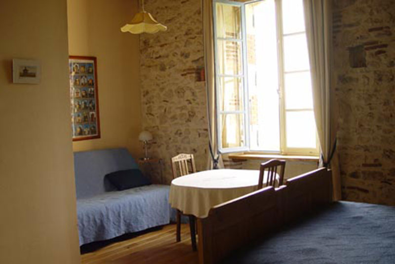 Kamer op het noorden met zicht op binnentuin. Badkamer en wc, tweepersoonsbed en een divan-lit voor twee personen, bureau.
