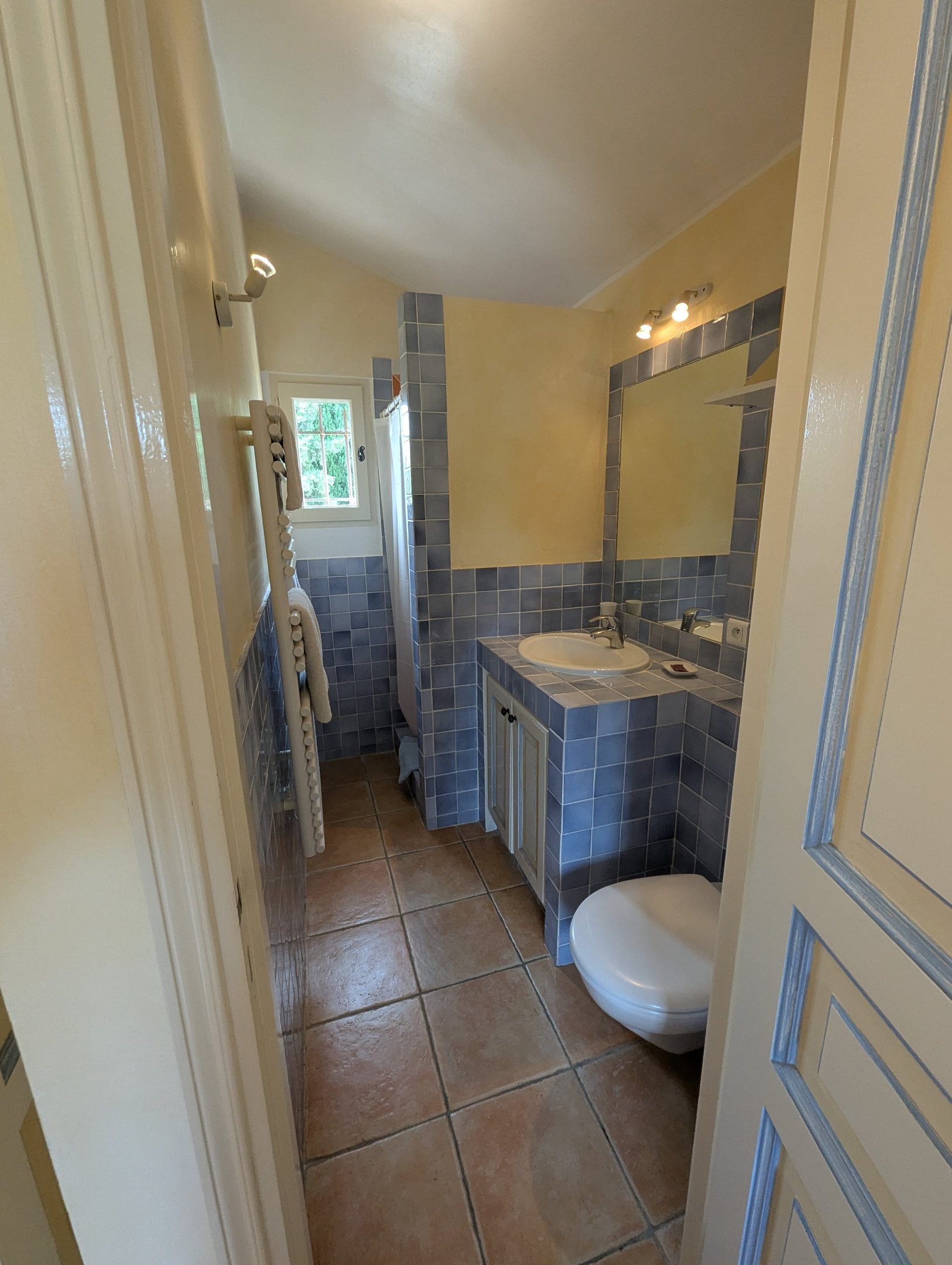 Privé badkamer met douche, wastafel en toilet.